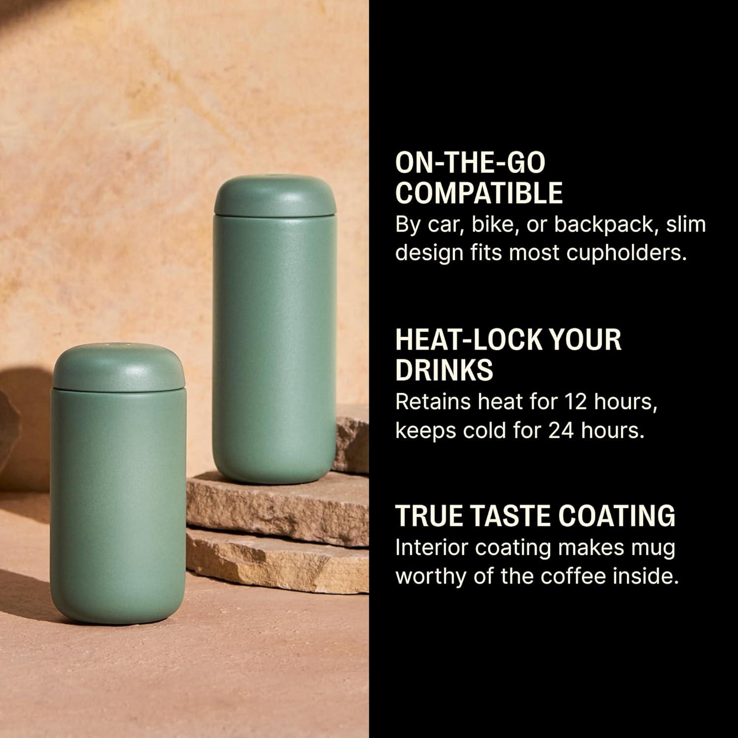 Fellow 8 oz Carter Move Travel Mug – Vacuum-Insulated Stainless Steel Travel Coffee Mug – Coffee Tumbler with Ceramic Interior and Splash Guard – Matte Grey(Smoke Green)