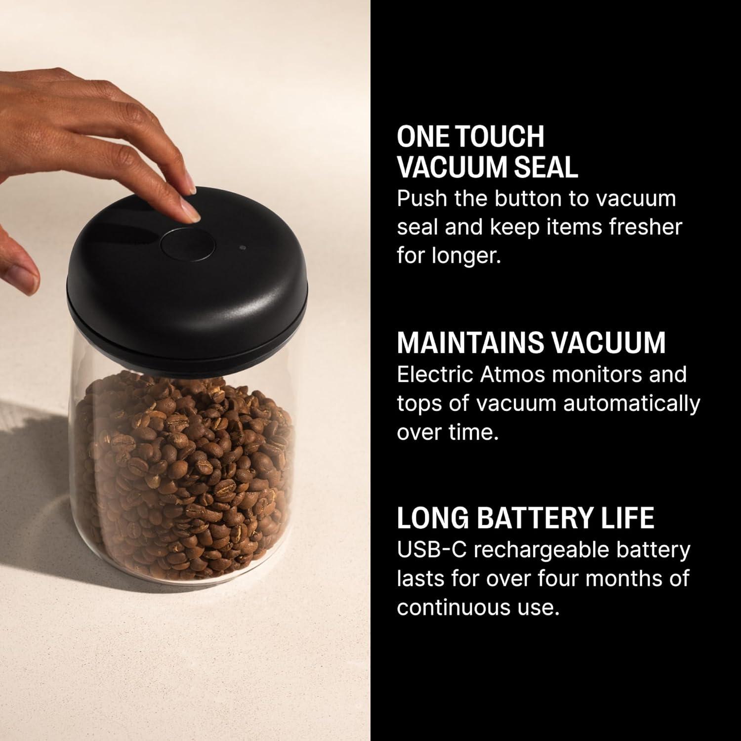GUARD THE GOODS: Keep your coffee beans fresher for longer with Electric Atmos, an automatic vacuum-sealing storage canister. Press the button on the lid to remove air from inside, limit oxygen exposure, and help keep your goods from going stale.